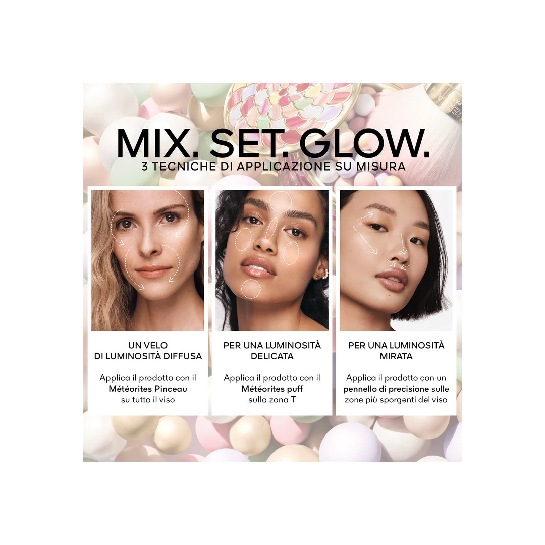 Svela lo splendore del tuo viso con le leggendarie Météorites di Guerlain, il segreto di bellezza che dal 1987 trasforma la luce in pura magia. Queste delicate perle di polvere, realizzate artigianalmente, racchiudono la tecnologia Stardust che cattura e riflette la luce per un effetto “soft focus” immediato. Ogni colore svolge una funzione specifica: il rosa per rinfrescare, il malva per catturare la luce, il verde per attenuare i rossori e l’oro per illuminare. Con una sola passata di pennello, la pelle appare levigata, radiosa e sublimata, avvolta dall’inconfondibile e delizioso profumo di violetta che rende ogni applicazione un momento di puro lusso.